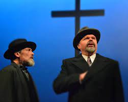 Soulignons l’épure du décor voulue par Alain Leempoel le metteur en scène : ces deux voies qui se croisent comme dans un nœud du ciel, derrière lesquelles on se plaît à imaginer la Méditerranée, et cet humus au sol, des écorces de châtaigniers au pied des palissades pour dire la condition humaine et son emprisonnement. Symbolisant la Passion: La Croix en plein ciel. Dona eis pacem.