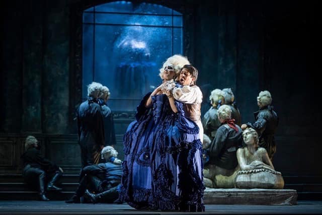 Il travaille avec les décors de Francesco Frigeri et les costumes de Marco Piemontese, tous deux aussi pour la première fois à L’opéra Royal de Wallonie. Regard railleur : les sombres couleurs de suie des costumes des courtisans à la cour décadente n’empêchent pas leur très grande beauté. Le montage des perruques, au propre comme au figuré, rappelle, avec une certaine ironie, ceux de la cour de Marie-Antoinette, où la folie des grandeurs allait jusqu’à y planter des oiseaux. Surprenante Contessa di Ceprano interprétée par Margaux de Valensart. Scène après scène, John Turturro crée de magnifiques tableaux symboliques sur fond de ruines et paysages, dans l’esprit XVIIIe du peintre Watteau, où les humains sont décidément de très petite taille face à la beauté de la nature. La luxuriance des arbres majestueux a certes été gommée, mais on peut les imaginer, cachés par des brouillards vénitiens. En signe de richesse symbolique du palais Renaissance abandonné, admirez les deux magnifiques marbres classiques de nymphes alanguies qui semblent mener un dialogue muet sur le plateau et servent de perchoir aux personnages, petite moquerie supplémentaire. Quoi qu’il en soit, John Turturro arrive à donner une impression de grand dépouillement, ce qui permet de se concentrer sur l’essence des personnages, comme si seuls l’intéressaient le feu dramatique et l’humanité qui les habitent.