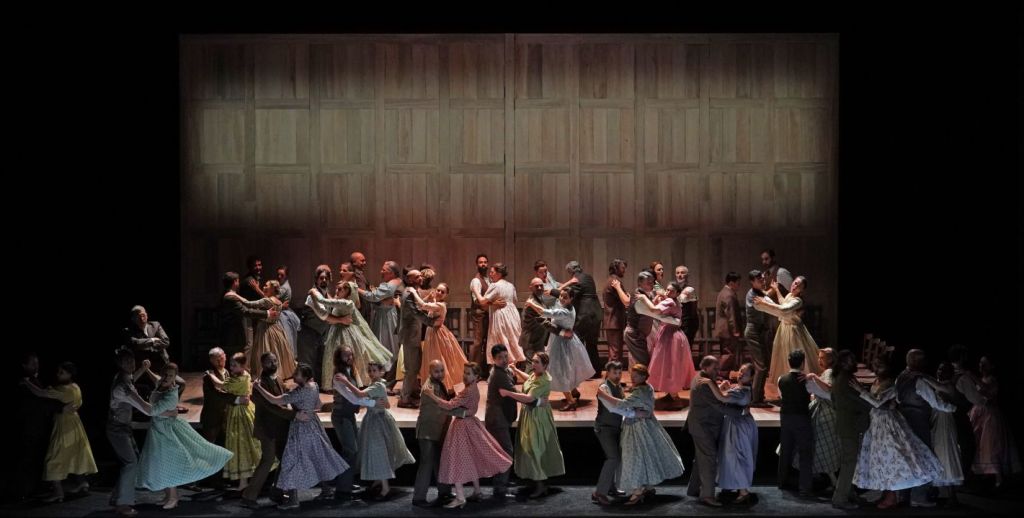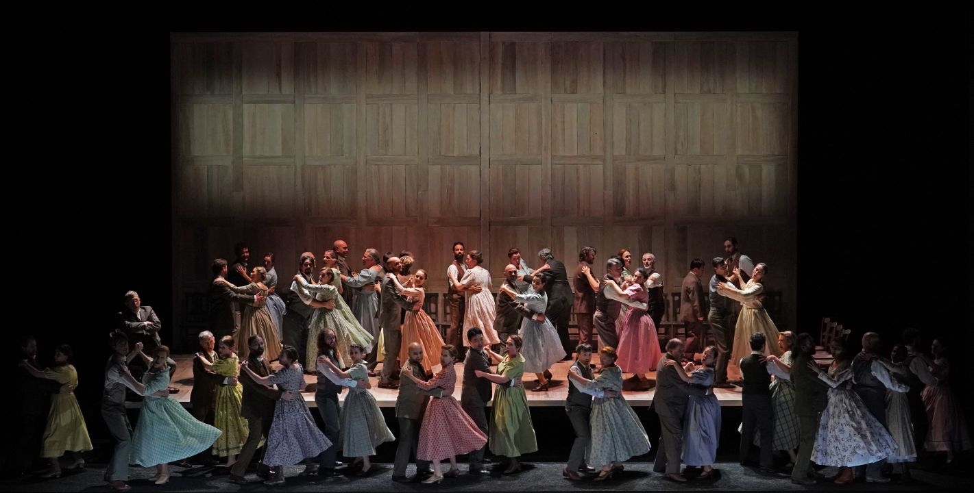 Olga, ici chantée par la chaleureuse mezzo-soprano Lilly Jørsta, est elle aussi très naturelle, pleine de joie de vivre et convaincante. Soulignons également le charisme et l’ardeur résonnante du riche prince Gremin que chante Nicolas Courjal et la merveilleuse et rafraichissante bouffonnerie – Molière es-tu là ? – de Christophe Mortagne dans le rôle de Monsieur Triquet. Quant au fabuleux chœur, une masse parfois oppressante, toujours en mouvement, sous la direction de Jan Schweiger, il est à la fois radieux et bouleversant dans les multiples atmosphères qu’il incarne.