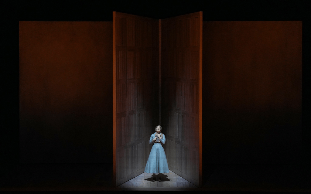 Surprise étonnante au lever du rideau ! Point de soleil d’hiver russe, de champs fraichement moissonnés, de moulin à eau, de datcha lumineuse à la Tourgueniev, de femmes vaquant aux tâches domestiques comme on pourrait s’y attendre. … Le plateau est vide, comme un radeau ivre sur un océan d’émotions et de vagues de passion. C’est que ce décor unique et étrange, intemporel, est animé de vie, il semble même parler comme parlent les livres… Et pourtant, il n’est constitué que d’une immense carré de parquet en bois blond, mystérieusement articulé et posé sur un axe… Toute une cosmologie? Les Chinois ne représentent-ils pas la Terre par un carré, comme les champs qu’ils cultivent ? Le spectateur du monde que nous sommes peut donc observer les choses: tandis qu’elles vont, se font et se défont. Aux quatre coins, tels ceux d’une rose des vents, siègent, chacune sur sa chaise rustique, quatre femmes sans âge en robes simples, de couleurs pastel : Tatiana en bleu tendre, Olga en rose pâle, Larina, leur mère (la mezzo-soprano Bernadetta Grabias) en vert tilleul et la vielle nourrice Filippievna (Cristina Melis) en bleu gris argent.
