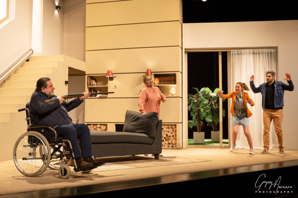 Critique acerbe de la manipulation de la réalité – toujours une source d’angoisse profonde – cette pièce est une condamnation implicite d’une société basée sur le mensonge et totalement dénuée d’humanité. Et pourtant les rires fusent dans la salle. C’est tout l’art de l’auteur. Est-ce par pur cynisme que les aînés sont poussés en dehors des derniers joyeux sentiers de la vie pour finir reclus et abandonnés loin de leurs repères et de leur famille? Inès Dubuisson, au jeu très sûr incarne parfaitement l’attitude passive et égarée de la femme de ce chef de famille, certes un peu caractériel, mais qui aurait eu droit à plus d’égards, non? Enfin, ce spectacle étrange illustre bien l’égoïsme foncier de notre société où tout est bon à jeter.