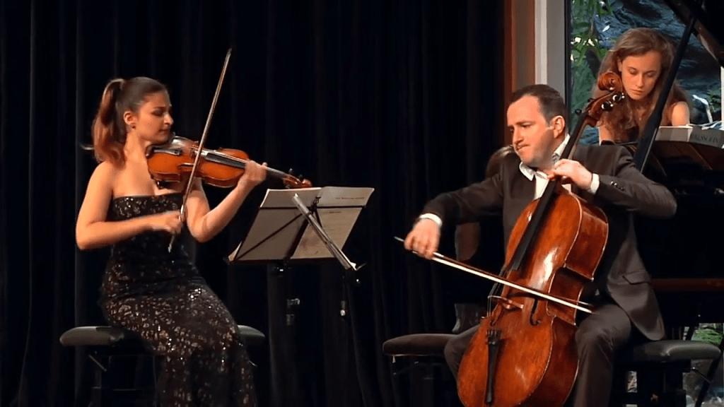 En hommage, voix (Olga Kharchenko), piano (Eliane) et violoncelle s’unissent ce soir pour dire les souvenirs éternels, et pour souffler à tout jamais à la jeune Adèle Khramouchin, âgée de 18 mois, des mots d’amour et de tendresse pour deux. Les derniers feux du soleil couchant parlaient aussi pour lui ce soir-là. Sacha, le compagnon et le père adorés. Ils disaient le bonheur perdu, il chantaient le couple et l’immense tendresse du père et de sa fille. La création vidéo de Valentine Jongen a bouleversé les invités d’Eliane Reyes.
