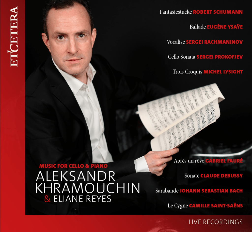 Malgré le magnifique élan de solidarité qui imprègne cette soirée, les amis de la pianiste se sentent impuissants, démunis, révoltés devant cette brutale fatalité qui a ravi à la jeune famille la lumière de leur amour. Comme si le destin avait mis par mégarde un bémol à la tragédie, et pour garder à tout jamais le souvenir d’Aleksandr, pour transmettre son talent à ceux qui l’ont apprécié, écouté et pour tous ceux qui pourront le découvrir dans le futur, les derniers enregistrements de studio, de concerts, prestations de jeunesse ou récentes, … ont été remasterisés et édités sur un coffret sous le label Etcetera. L’album CD « Aleksander Khramouchin & Eliane Reyes – Music for Cello & piano » contient en effet leurs ultimes prestations ensemble, …si providentiellement enregistrées. Le violoncelliste possède pleinement la sonorité poétique d’un instrument dont il a une maîtrise absolue. Sa brillante virtuosité renforce une expressivité généreuse, tantôt délicate, tantôt flamboyante, tout en transmettant à chaque instant, la profondeur et le mystère de l’émotion dans les moindres détails. 81 minutes 13 secondes d’amour partagé.