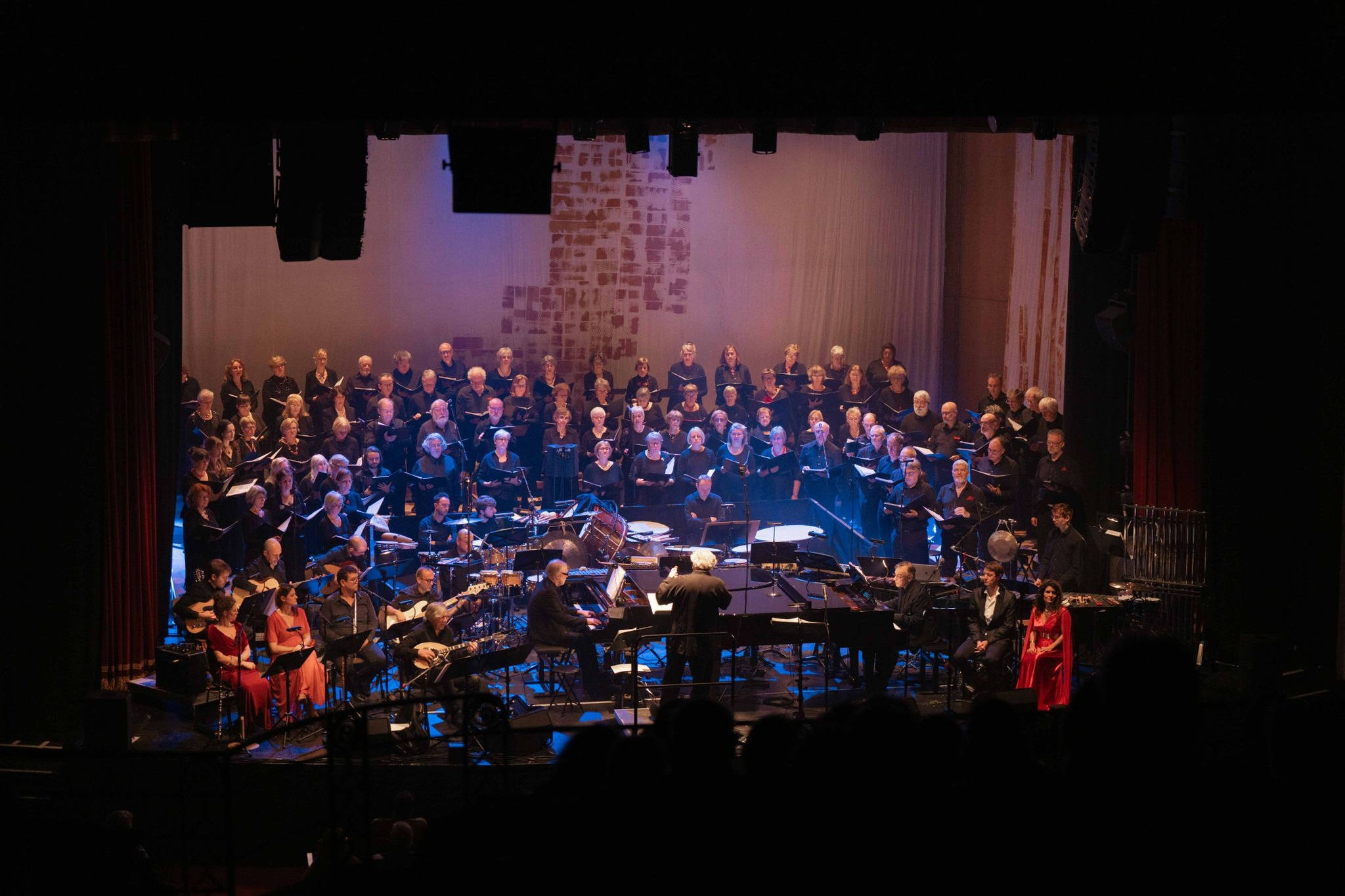 Mais, à mesure que le spectacle progresse, malgré la puissance océanique instrumentale et vocale, on se met à ressentir une légère frustration. Les textes chantés que l’on le sent d’une grande richesse et d’une densité poétique et politique intense ne sont pas traduits. Comment capter tout ce flux émotionnel ? On se met à rêver de l’accompagnement d’une bande déroulante proposant une traduction simultanée des paroles chantées… C’est un grand manque, la grande faiblesse de cette salle ? Le livret-programme, pourtant fort détaillé, ne peut raisonnablement être consulté dans l’obscurité d’une salle. Faire un discret usage d’une lampe de poche ou de l’éclairage d’un téléphone c’est rompre la concentration et le recueillement des artistes. Quant aux interventions minutées du narrateur, elles offrent certes, un cadre, mais demeurent difficiles à retenir tant la matière textuelle est dense mais hélas, volatile.