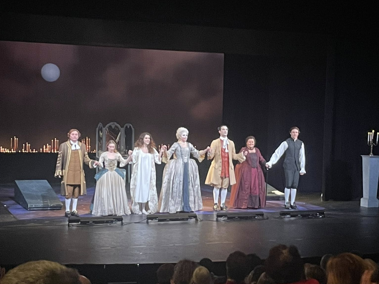 La mise en scène admirablement musicale et fluide d’Arnaud Denis relie, respire, nette, lisible, sans jamais être pesante. Elle est pensée au millimètre près avec la valse du sobre du riche mobilier et des décors sur cette immense scène du Wolubilis éclairée à la bougie, tandis que circulent dans l’air, des tonnes d’électricité. Le jeu théâtral des 7 comédiens porte majestueusement cette magnifique langue de Laclos qui voyage entre les scènes jouées sur tous les tons de la séduction, du viol, de la manipulation, de la blessure profonde, et la lecture en voix off, tranquille et puissante des Lettres révélatrices. Celles-ci apparaissent alors comme autant de plages de repos, à savourer les yeux fermés.
