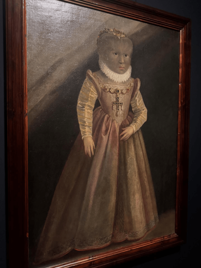 Plus loin, on s’attardera pour découvrir la vraie histoire de la Belle et la bête. Avec une œuvre qui intrigue, interroge, bouleverse. C’est le portrait de Maddalena Gonsalvus, fille de Petrus Gonsalvus, atteint d’hypertrichose, un cas de pilosité extrême. Ce noble canarien à la pilosité spectaculaire, avait épousé une femme d’une grande beauté. Leur histoire inspira une légende qui hante toujours notre imaginaire : celle de La Belle et la Bête. Maddalena, représentée avec tendresse, dignité et une forme de fierté, rappelle à quel point l’humanité peut surgir dans ce qui dérange. Ici, aucune caricature. Maddalena est représentée comme une princesse, respectée, aimée, entourée. Une dimension profondément humaine traverse ce tableau : celui d’un père qui élève sa fille dans la dignité, malgré un monde prompt au jugement.